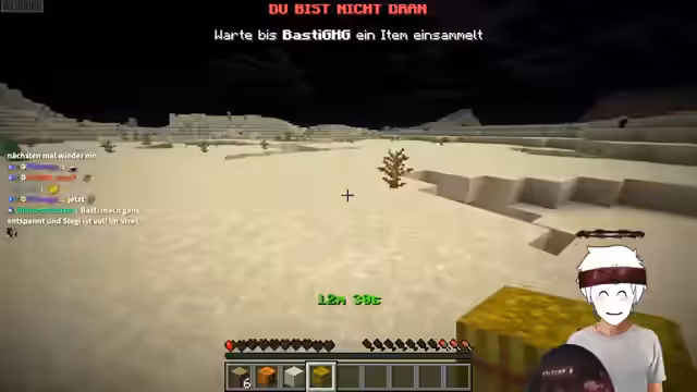 04:40:26Der Streamer und sein Partner Basti spielen eine spezifische Minecraft-Challenge, in der sie alle Aktionen synchron durchführen müssen. Während der Streamer sechs gebratene Kartoffeln gefunden und in seinem Inventar gespeichert hat, scheitert Basti daran, ebenfalls sechs Stück zu beschaffen. Die Situation entwickelt sich zu einem langen Warte- und Suchprozess, da Basti seine Kartoffeln wahrscheinlich verzehrt hat und nun Strukturen nach einer Truhe mit genau sechs Kartoffeln durchsuchen muss. Diese Herausforderung wird als 'hostisch' beschrieben und führt zu erheblicher Frustration und Unterhaltung für die Zuschauer.