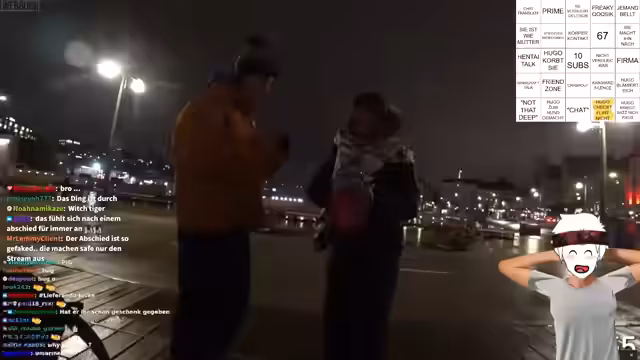 05:45:11Der spontane Abbruch des Streams wird thematisiert, wobei Hugo erklärt, dass er am nächsten Morgen früh aufstehen muss. Es wird ein Missverständnis bezüglich eines Karaoke-Bar-Besuchs aufgeklärt, der sich als Scherz von Hugo herausstellte. Ein weiteres Thema ist ein Armdrücken, bei dem Hugo nicht verlieren wollte, um nicht als 'Looser' dazustehen, besonders nicht gegen eine Frau. Die Diskussion dreht sich auch um unangenehme Momente im Stream, insbesondere das Fotografieren, bei dem Hugo Schwierigkeiten hatte, verschiedene Posen zu finden, und eine Situation, in der er unbeabsichtigt ein russisches Schimpfwort wiederholte, ohne dessen Bedeutung zu kennen. Dies führte zu einer peinlichen Situation, die er später erst verstand.