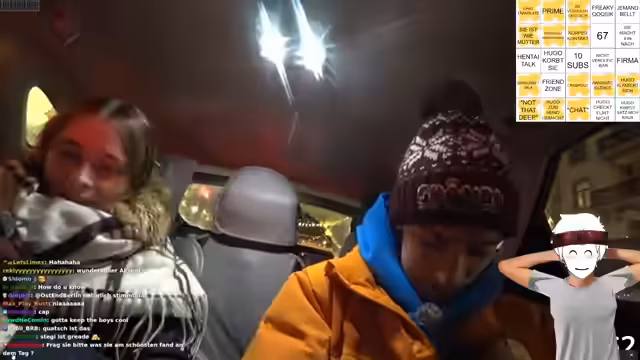 02:37:53Hugo äußert, dass er sich ein bisschen betrunken fühlt, da er nicht oft trinkt. Er bezeichnet den Abend als seinen 'geilsten Donnerstag des ganzen Jahres'. Die Situation eskaliert, als er anfängt zu rennen, was als 'unlimited stamina unlocked' beschrieben wird. Seine Begleiterin scheint eine Mission zu haben, um Informationen aus ihm herauszubekommen. Es wird befürchtet, dass Hugo durch diese Erfahrung Gefallen am betrunkenen Streamen finden und dies zu einer Gewohnheit werden könnte. Die Szene wird als 'Soundkulisse aus gerade' und 'Zaubertrank getrunken' beschrieben, was die absurde und unterhaltsame Natur des Geschehens unterstreicht.