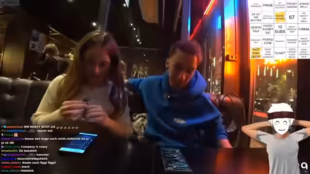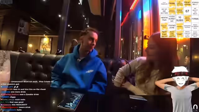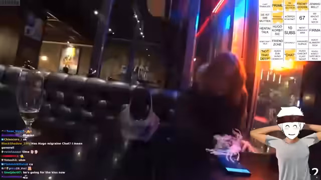01:55:24Hugo wird dafür kritisiert, dass er Alkohol trinkt, obwohl er angeblich keinen Alkohol konsumiert, abgesehen von Experimenten. Der Chat reagiert stark auf dieses Thema, und es wird angemerkt, dass der Chat unlesbar wird, da jede Handlung bewertet wird. Es wird klargestellt, dass es sich nicht um ein Date handelt, obwohl es so aussehen mag. Die Interaktion zwischen Hugo und seiner Begleiterin wird als dynamisch beschrieben, wobei sie ihn in bestimmten Situationen lenkt. Es wird auch über die Möglichkeit gesprochen, Hugo zum 'Snoozen' zu bringen, was als verrückt und unterhaltsam empfunden wird.