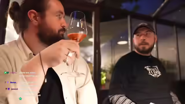 10:04:17Das Weingut Margaritenhof von Niklas Weber wird vorgestellt, ein Herzensprojekt mit Weinbergen an der südlichen Weinmose und an der Saar. Die unterschiedlichen Terroirs und die Mineralität des Riesling-Kabinett werden hervorgehoben. Niklas'Traditionsbewusstsein und seine moderne Herangehensweise werden gelobt. Es wird erklärt, dass der Riesling mit nur 9,5 Prozent Alkohol einen entspannten Start in die Weinbegleitung ermöglicht. Die Lage Eile Kupp-Riesling wird erwähnt, und es wird erklärt, dass der Wein gut zum nächsten Gang mit Opsi Blue Garnele und Rote Beete passen wird, da er als Brücke zwischen den Aromen fungiert. Die Freude über die Weinbegleitung wird ausgedrückt. Jörg Geiger wird als einer der tollsten Pioniere für alkoholfreie Begleitungen vorgestellt, insbesondere seine 32, 34, 36 Grad Linie mit entalkoholisiertem Riesling, Apfel und Kräutern. Die Begeisterung für Geigers Sortiment wird geteilt, und es wird von einem persönlichen Treffen auf der MS Europa berichtet. Es wird betont, dass Geiger mit Herzblut hinter seinen Produkten steht. Der Tipp gegeben, zuerst einen Schluck des Getränks zu nehmen und dann beim Essen noch einmal, um den Unterschied zu erleben. Die schweren Gläser werden positiv hervorgehoben. Der Schnaps wird heute ausgelassen, da es in der Vergangenheit zu unerwünschten Ereignissen gekommen ist. Der Chat wird aufgefordert, den Schnapstrip mit der Kelle zu finden, jedoch nicht den von Julian. Es wird erwähnt, dass mehr Getränke als üblich vorhanden sind, da sieben Personen am Tisch sitzen. Die Freude über den langen Tag und die bevorstehenden Ereignisse wird ausgedrückt.
