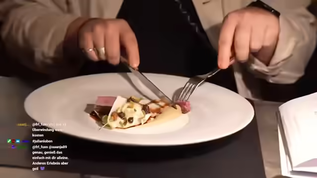 12:11:01Es wird die extreme Begeisterung für das Reh-Gericht ausgedrückt, das als "absurd" und "bodenlos" bezeichnet wird. Der Streamer scherzt, er würde einen Jagdschein machen, um selbst an das Fleisch zu kommen. Die Kombination mit dem Lardo wird als genial empfunden. Es wird fast geweint vor Begeisterung. Der Streamer ist wütend, dass nicht jeder dieses Gericht probieren kann. Es wird bedauert, dass dies der letzte Gang ist, obwohl sich das Menü regelmäßig ändert. Es wird ein exklusiver Content angekündigt, von dem der andere Streamer nichts weiß. Der Chat wird gebeten, keine Clips vom Mittagessen zu schicken. Anschließend wird der andere Streamer beim Essen des Gerichts gefilmt, um die Reaktion einzufangen. Es wird betont, dass der Chat hier etwas sieht, was erst in Monaten veröffentlicht wird. Der Streamer ist so begeistert, dass er kurzzeitig "im Wald" war und die Bäume gesehen hat. Er vergleicht das Gericht mit nichts, was er zuvor gegessen hat.