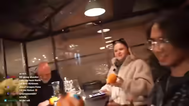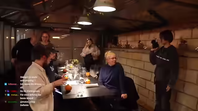 12:24:20Das Hauptgericht im Sterne-Restaurant wird mit Begeisterung aufgenommen, die Qualität des Essens wird außerordentlich gelobt. Es wird die Spontanität des Abends hervorgehoben, die zu einer unerwarteten Tour durch die Stadt mit Pierre M. Krause, Lena Meyer-Landrut und Casper führt. Es wird eine Anekdote über einen Kaffeeunfall beim Aussteigen aus dem Auto erzählt, die zu einer Wette führte. Zudem wird ein handbemalter Kürbis als Geschenk erwähnt, was zu einer spontanen Challenge ausgerufen wird: Die Zuschauer sollen am nächsten Tag mit Kürbissen durch Leipzig laufen. Die Kürbisse erhalten Namen und werden zu Maskottchen für den Abend erklärt, was die Stimmung weiter auflockert und für viele lustige Momente sorgt. Die skurrile Situation und die Freude darüber, dass die Zuschauer daran teilhaben, werden betont.