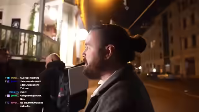 13:01:57Ein Zuschauer überrascht mit einem Geschenk aus seiner eigenen kleinen Modemarke in Leipzig. Der Streamer zeigt sich begeistert von der Aktion und interviewt den jungen Designer spontan. Der Designer erklärt, dass seine Marke für "endloses Lachen am Leben und endlose Liebe sein und Liebe verbreiten" steht. Der Streamer lobt das Storytelling und die Idee hinter der Marke, sieht aber das Potenzial eher in anderen Kunstformen als Textilien. Er ermutigt den Designer, seine Ideen auf anderen Untergründen wie Streetart, Leinwänden oder im Bewegtbild umzusetzen. Abschließend bedankt sich der Streamer für das Geschenk und wünscht dem Designer viel Erfolg.