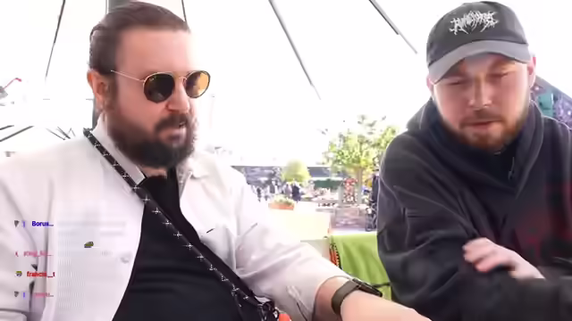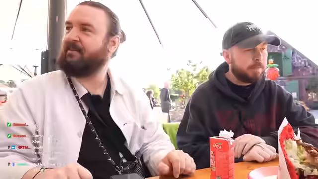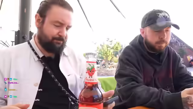 01:48:19Es wird über die Thematik Döner diskutiert und eine Werbung von Burger King erwähnt, in der der Sohn des angeblichen Designers des Döner-Logos zu sehen ist. Er überlegt, ob frische Erdbeeren im Döner gut schmecken würden. Er lobt den Erdbeer-Ayran und würde ihn auch zu einem normalen Döner trinken. Er möchte nicht nur über Essen sprechen, sondern auch den Freizeitpark erkunden und Achterbahn fahren. Er ist besorgt wegen der Kabel und der Sendeausrüstung auf der Achterbahn. Er erwähnt, dass die Schafsoße nicht mehr verkauft wird. Er hat Angst, dass eine Wespe in sein offenes Getränk fliegt. Er ist gespannt auf die Fahrgeschäfte, fährt aber normalerweise keine, wenn er viel gegessen hat. Er stellt fest, dass es im Erdbeerdorf sehr voll ist und empfiehlt, es unter der Woche zu besuchen.