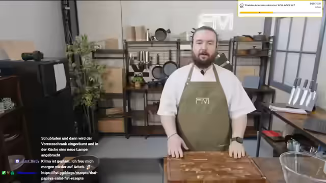 00:23:57Nach dem Kochsegment, das auf einige technische Probleme beim Schneiden der Papaya stieß, kündigt der Streamer einen besonderen Gast für den weiteren Verlauf des Streams an. Er preist ihn als weltbekannten Musiker, der auch kocht und einen eigenen Koch-Channel hat, ohne den Namen direkt zu nennen.
