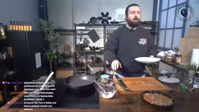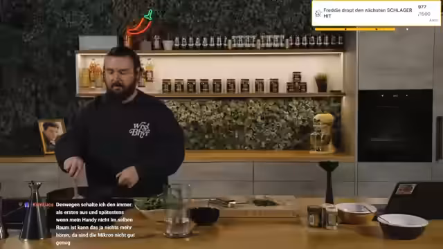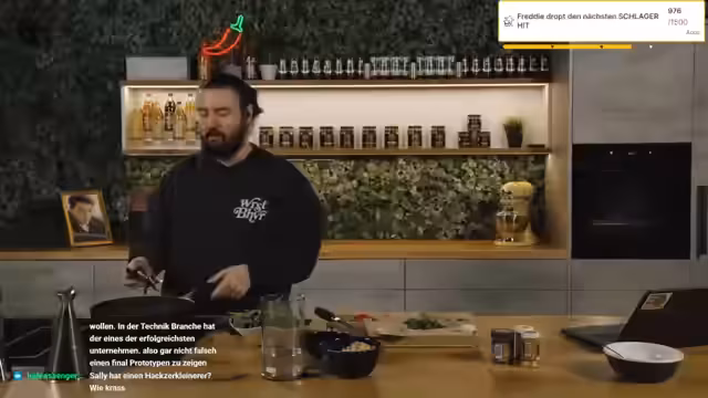 05:39:50Nach dem ausführlichen Smart-Home-Exkurs kehrt der Streamer ins Kochstudio zurück. Hackfleisch wird mit Öl, Chili und Knoblauch angebraten. Das Gericht basiert auf einem Rezept für eine Kichererbsen-Hackfleischpfanne, das der Streamer als seltsam und komplex empfindet. Er muss einige Abwandlungen vornehmen, da ihm Zutaten wie Mangold oder spezielle Kichererbsenflüssigkeit fehlen, und nutzt stattdessen Spinat und Wasser.