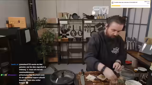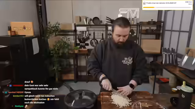 00:16:16Nach allgemeinen Gesprächen wechselt der Stream zum Hauptthema, der Zubereitung von Gyoza. Es wird die Füllung aus Hackfleisch, Kohl, Frühlingszwiebeln und Knoblauch zubereitet. Der Streamer beschreibt den Vorgang des klein Schneidens und Hackens der Zutaten im Detail. Parallel dazu wird eine einfache Dipping-Sauce aus Sojasauce und La-Yu (einem Chili-Öl-Gemisch) angerührt, die als geschmackliche Ergänzung dienen soll.