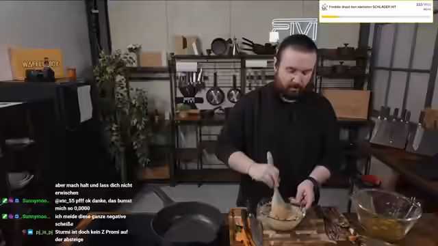 00:20:58Der Streamer beginnt mit der Zubereitung von Gemüsebratlingen mit Joghurt-Dipp. Er beschreibt die einzelnen Schritte des Kochprozesses im Detail: Raspeln von Möhren und Zucchini, Ausdrücken der Gemüsemasse, Mischen mit Quark, Eiern, Tomatenmark, Sonnenblumenkernen, Hanfsamen, Leinsamen und Sojamehl. Er erwähnt auch die Notwendigkeit, die Masse salzen und für zehn Minuten ruhen zu lassen, bevor er die Bratlinge formt und in der Pfanne anbrät.