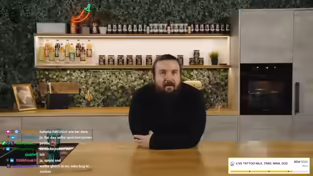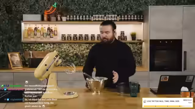 05:27:17Der Streamer bereitet den Teig für den Mandarinenstreuselkuchen vor und erwähnt, dass er Rezepte für Gartenmarmelade suchen muss. Er liest die Zutatenliste vor und misst die Zutaten ab, während er das Subziel für den Kanal erwähnt: Bei Erreichen von 199 weiteren Subs wird live im Stream tätowiert, wobei die Zuschauer die Location, aber nicht die Motive auswählen dürfen. Bei Timo dürfen die Zuschauer sogar Motive und Stelle aussuchen. Der Streamer spricht über die Möglichkeit, die Frequenz der Videos auf drei pro Woche zu erhöhen und kündigt Daily Videos auf dem Zweitkanal an. Nina, die im Chat aktiv ist, wird als Lebensmittelbeauftragte bezeichnet und gibt Tipps zur Verwendung von Marmelade. Es wird kurz überlegt, ob das Schwert vom Witcher im Hintergrund des Sit-Down-Sets platziert werden soll, aber Bedenken wegen der Richtlinien von TikTok werden geäußert.