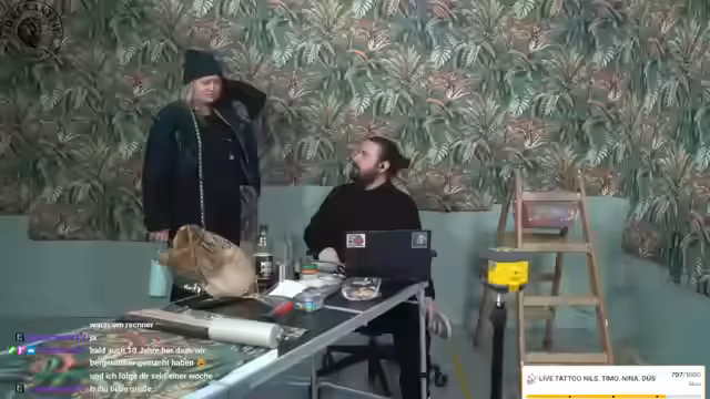 01:35:22Nachdem der Streamer den aufgebrachten Zuschauern erklärt hat, dass er kurz Notdurft verrichten muss, geht Nina ohne Mikro weiter im Chat. Vor dem Dreh des YouTube-Videos wird eine kurze Pause eingelegt. Die Streamer und das Team haben Lebensmittel neu einsortiert und einen Kühlschrank für den internen Bedarf eingerichtet, um die Vorbereitungen für den gemeinsamen Dreh zu optimieren.