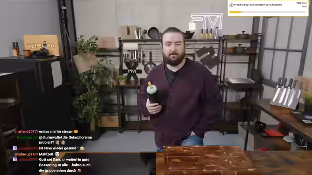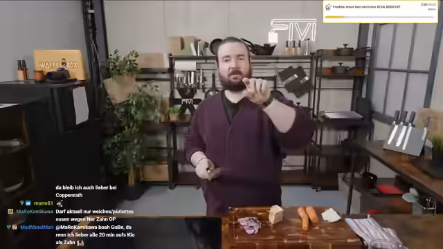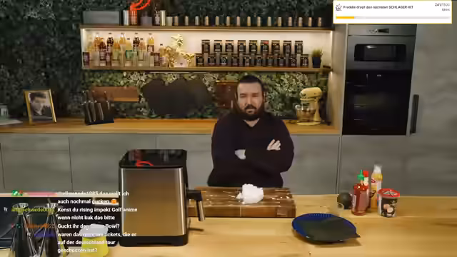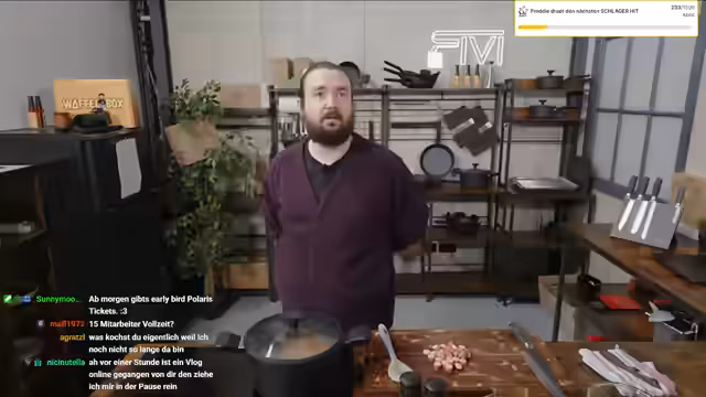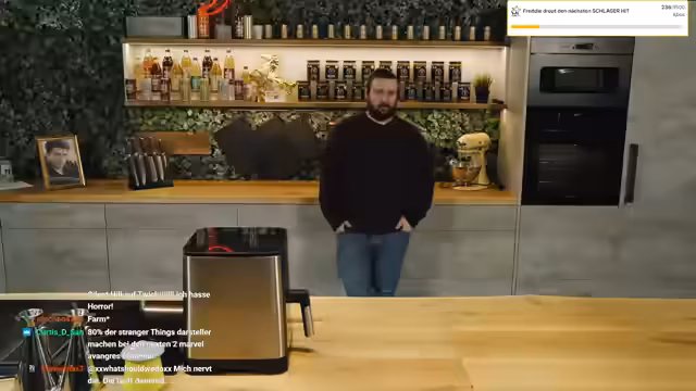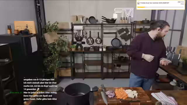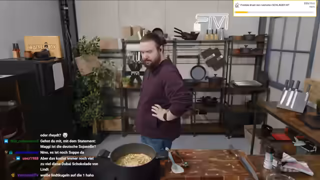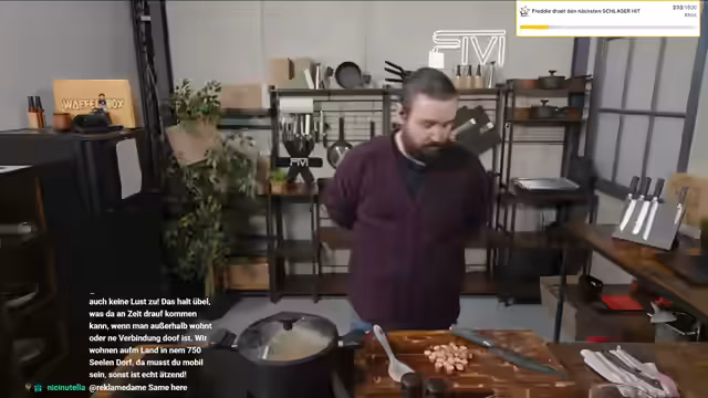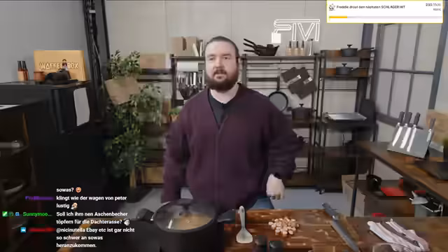 00:37:59Der Streamer beginnt mit der Zubereitung einer Linsensuppe 'wie bei Oma' im Rahmen seines HLF-Formats. Parallel dazu unterhält er sich mit dem Chat über unnütze Küchenutensilien und wechselt dann zu Plänen für die Weiterentwicklung des Büros. Er beschreibt ambitionierte Vorhaben wie den Aufbau einer Zapfanlage, die Integration eines Flipperautomaten und die Gestaltung des Eingangsbereichs. Er geht auch auf seine Videospielsammlung ein und erklärt, dass er sie aufräumen und Teile davon im Büro präsentieren möchte.