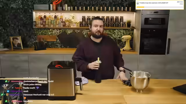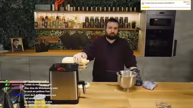 04:27:10Die Herstellung des Baumkuchens führt zu massiven Frustrationen. Die vielen vorbereiteten Zutaten sind über die gesamte Küche verteilt, was die Organisation erschwert. Der Prozess des Eier trennens und der räumliche Mangel im Studio führen zu starker Anspannung. Der Streamer bezeichnet die Backerei als 'Experience', bei der jegliche Ästhetik verloren geht, und beschreibt das Eischlagen als 'schlotzig' und 'eklig'. Das 'Speedrunnen' wird als notwendig erachtet, um den Vorgend schnellstmöglich zu beenden.