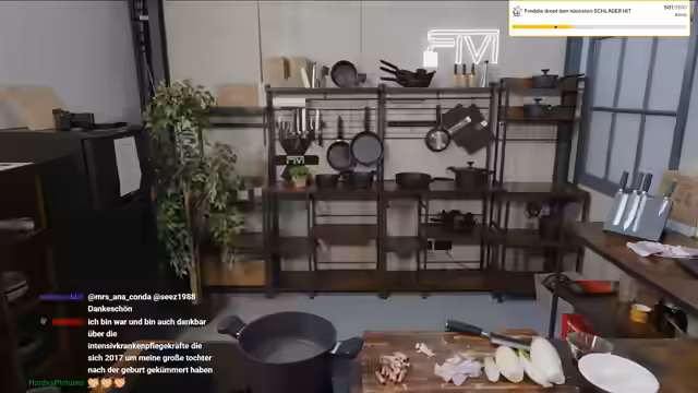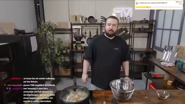 00:06:23Der Stream beginnt mit einer Begrüßung und der Ankündigung des heutigen Gerichts: Pasta mit gebratenem Chicorée. Anschließend wird das Wochenende rekapituliert: Am Freitag wurde eine neue Martini-Freitag-Location in MG Action Town mit Julian, Ryan und Nino getestet, wo man günstig Erdbeermargaritas trank. Am Samstag verbrachte man den Tag im Stadion beim Spiel von Borussia Mönchengladbach gegen Wolfsburg. Am Sonntag folgte ein Abendessen mit der Mutter als Geburtstagsgeschenk, was sehr schön war und öfter gemacht werden soll.