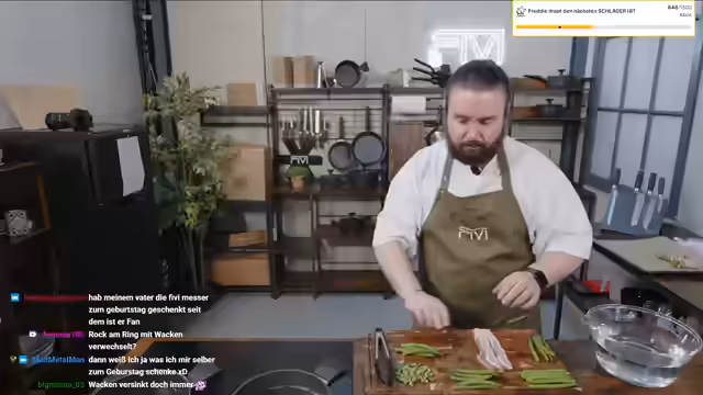 00:07:02Der Stream wechselt zum praktischen Kochsegment, in dem Bohnen im Speckmantel zubereitet werden. Zuerst werden die Kartoffeln gewaschen und in Salzwasser gekocht, während anschließend grüne Bohnen geschnitten und in einem separaten Topf gekocht werden. Parallel dazu wird eine selbstgemachte Rosmarinbutter hergestellt, indem Butter mit Rosmarin und Zitronenabrieb vermischt wird. Das Rezept wird auf der Webseite fiwi.g zur Verfügung gestellt. Besonderes Augenmerk liegt auf der sorgfältigen Vorbereitung und Anordnung der Zutaten.