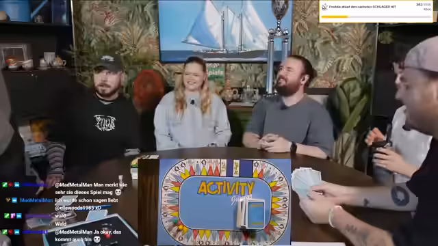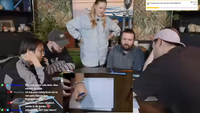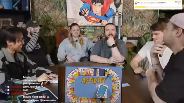 03:05:43Es wird angekündigt, dass nach einer kurzen Pause der Martini-Freitag stattfinden wird, bei dem gemeinsam gespielt wird. Es wird eine große Umbau-Überraschung vorbereitet und die Teilnehmer einigen sich auf das Spiel Activity. Die Tischkamera wird eingerichtet, um das Spielbrett besser zu zeigen. Die Teams für Activity werden ausgelost, wobei Nina mit sich selbst und Dues mit Freddy ein Team bildet. Die Regeln von Activity Junior werden erklärt: Die Spieler müssen Begriffe entweder zeichnen, umschreiben oder pantomimisch darstellen, während die Zeit mit einer Sanduhr gemessen wird. Wer zuerst im Ziel ist, gewinnt. Es wird humorvoll angemerkt, dass das Spiel mit Leuten aus der Medienszene aufgrund ihrer Fähigkeiten besonders herausfordernd sein wird. Luna wird für einen zukünftigen Martini-Freitag zum Saufen eingeladen.