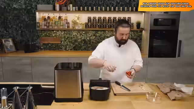 04:02:25Die Zubereitung von gebrannten Mandeln in der Heißluftfritteuse wird fortgesetzt. Nachdem Wasser und Zucker zu den Mandeln gegeben wurden, wird alles gut verrührt, bis eine matschige Konsistenz entsteht. Es wird angemerkt, dass es einfacher gewesen wäre, dies in einer separaten Schüssel zu mischen, aber man hält sich an das Originalrezept. Der Geruch wird als sehr angenehm beschrieben, und die Erwartung ist groß, dass das Ergebnis so gut wird wie bei den Eiern. Es wird betont, dass die Zubereitung von gebrannten Mandeln auf dem Jahrmarkt viel aufwendiger ist, und die Möglichkeit, dies kostengünstig in einer Heißluftfritteuse zu Hause zu machen, wird als lebensverändernd bezeichnet. Die Mischung wird bei 180 Grad für 15 Minuten in die Heißluftfritteuse gegeben, wobei zwischendurch immer wieder geschüttelt werden soll, um ein Verklumpen zu verhindern. Das Rezept wird als einfaches und „wildes“ Rezept gelobt.