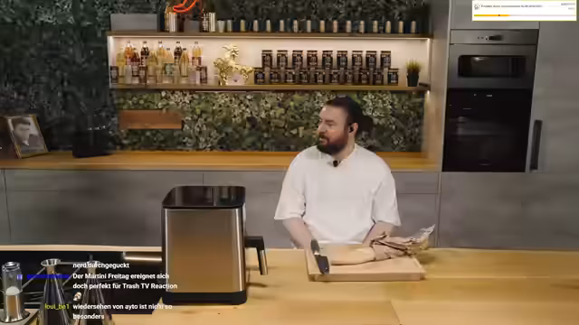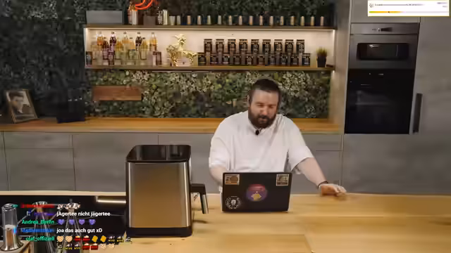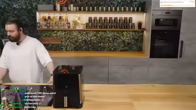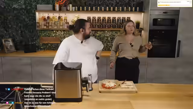 04:05:38Während die Mandeln in der Heißluftfritteuse sind, äußert sich der Streamer hungrig auf das bevorstehende Kochduell und hofft, etwas Gutes zaubern zu können, unabhängig vom Wettbewerb, da der Hunger groß ist. Es wird die Community gefragt, ob sie bereits Erfahrungen mit der Zubereitung von gebrannten Mandeln in der Heißluftfritteuse gemacht hat. Das Originalrezept stammt von Pearl Vaeth und wird unter dem Video verlinkt. Anschließend wird über neue Tiefkühl-Obst-Desserts gesprochen, die auf Cedric Roulet basieren und als zukünftiges Thema für die 'Food News' in Betracht gezogen werden. Es wird erwähnt, dass Nina die Idee für das 'Food News'-Format hatte, da jährlich 180.000 bis 200.000 neue Lebensmittelprodukte auf den Markt kommen, was unzählige Möglichkeiten für das Format bietet. Der Streamer sitzt extra neben der Heißluftfritteuse, um die Mandeln alle fünf Minuten zu schütteln und zu überprüfen.