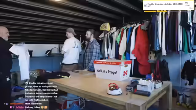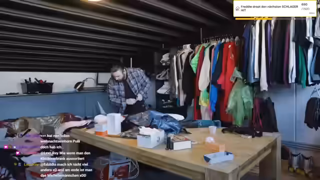 01:49:38Zu Beginn wird über diverse Kostüme, Merchandise-Artikel und Lagerbestände gesprochen. Es gibt eine Vielzahl an Kostümen wie T-Rex, Alien, Fee, sowie viele Mützen, Hosen und Schals. Es wird auch über verschiedene Kostümzubehör wie Perücken, Handschuhe und Gegenstände aus vergangenen Streams berichtet. Besonders hervorgehoben wird die große Menge an Gegenständen, die sortiert und eingelagert werden müssen, inklusive Kleidung, die zuvor gewaschen werden sollte. Der Streamer stellt fest, dass sie im Stream zu wenig Kostüme tragen und bittet die Zuschauer, sich am Sortieren zu beteiligen.