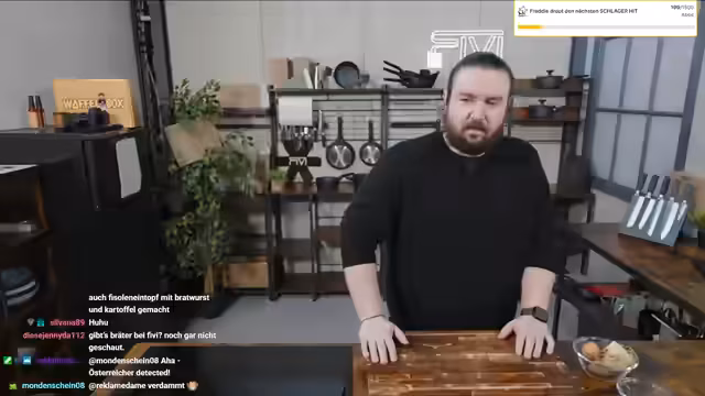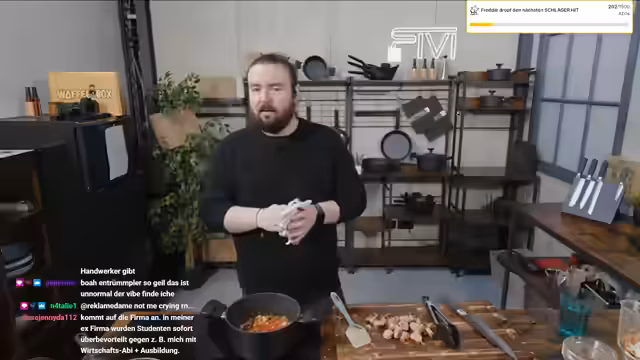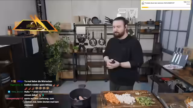 00:12:01Der Stream startet mit einer Begrüßung und einer kleinen Verzögerung, da zunächst ein Geräusch von einem heruntergefallenen Gegenstand im Hintergrund verursacht wurde. Anschließend stellt der Streamer sein Mittagsgericht vor: einen Wurst-Bohnentopf. Er beginnt mit dem Vorbereiten der Zutaten, indem er Suppengrein putzt, schneidet und Knoblauch klein hackt. In einem Bräter wird Öl erhitzt, in dem Bratwürste angebraten werden, bevor das vorbereitete Suppengrün hinzukommt. Der Topf wird mit Bohnen und etwas Brühe aufgefüllt und muss nun 15 Minuten köcheln.