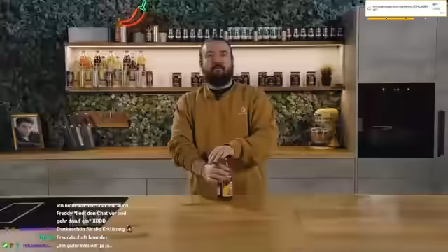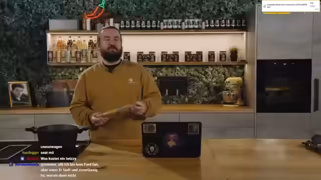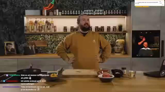 00:16:15Während des Kochens interagiert der Streamer stark mit dem Chat. Es wird ein Hype-Train gestartet, und als Belohnung für das Erreichen bestimmter Stufen werden Challenges für einen Mitarbeiter namens Timo in Aussicht gestellt. Es werden verschiedene Ideen wie ein Raser-Haarschnitt (R9), ein Piercing, ein Tattoo oder ein Wachs-Behandlung der Armhaare diskutiert, wobei der Streamer Timos Begeisterung bei gleichzeitigem Bedenken für dessen Wohlbefinden zum Ausdruck bringt.