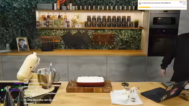 01:39:09Endlich beginnt das eigentliche Backen. Die Zutaten für einen Churro Cheesecake werden vorgestellt und vermischt. Der Streamer stellt sein aufkeimendes Misstrauen gegenüber einem sarkastischen Chat-Kommentar zur Schau, der ihn aus dem Konzept bringt und ihn dazu veranlasst, den Chat zu ignorieren, um sich auf die Aufgabe zu konzentrieren. Das Rezept scheint ihm vertraut, aber aufgrund der gesundheitlichen Verfassung wirkt der Vorgang für ihn doch etwas anstrengender und aufreibend als sonst.