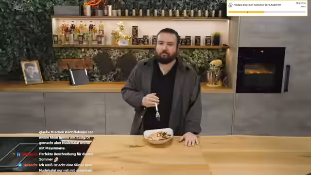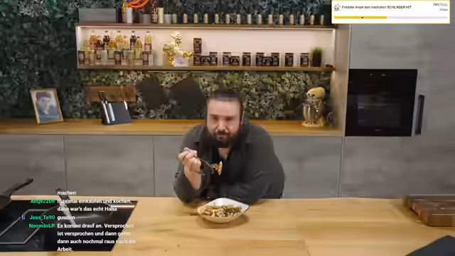 03:21:41Nach einem langen Einkaufs- und Testtag kündigt der Streamer einen Koch-Stream an, bei dem Schupfnudeln mit Hackfleisch und Gorgonzola zubereitet werden. Dabei zeigt sich, dass vorbereitete Rezepte nicht rechtzeitig gepostet wurden, was zu frustrierenden Situationen führt. Während des Kochens gibt es Gespräche über Tennis, Getränke und persönliche Matters wie neue Möbel. Auch das Thema Fankultur und Fanartikel wird kurz angesprochen.