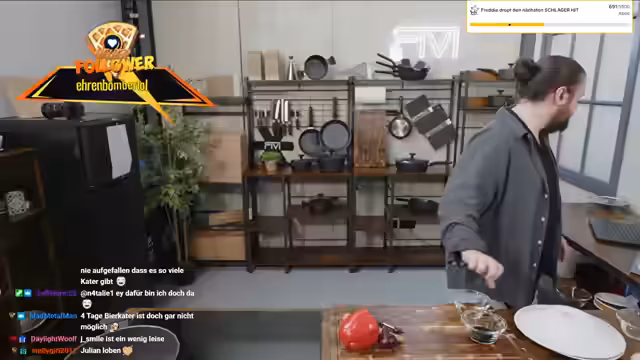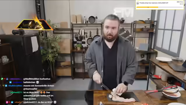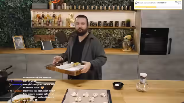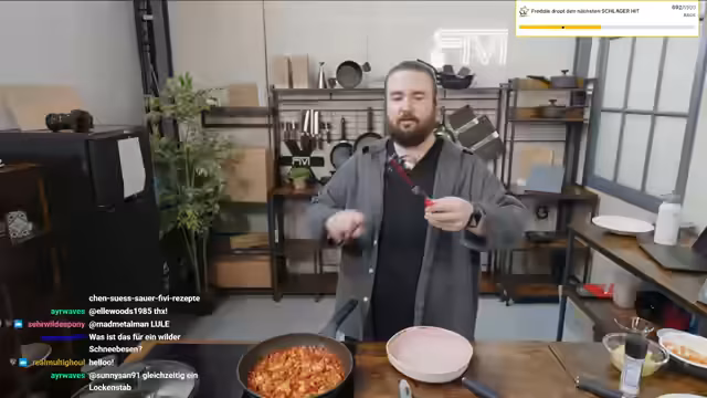 01:02:35Ein Zuschauer fragt nach einer Küchenmesser-Empfehlung. Der Streamer empfieht die Messer von seiner eigenen Marke FIWI, die nicht in die Spülmaschine gehören. Anschließend reflektiert er seine persönliche Entwicklung und verspricht, wieder mit dem Krafttraining anzufangen. Er erwähnt auch, dass er viele Impulse dieses Jahr gegeben hat und sich weiterentwickeln will. Er zeigt auch einen Prototyp eines Schneebesens, den sie für FIWI getestet haben.