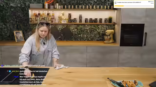 03:28:33Die Zubereitung des Sauerteig-Kohls wird fortgesetzt und mit der Belüftung der Masse fortgesetzt. Der Streamer vergleicht den Vorgang humorvoll mit einem Ketose-Anfall. Anschließend wird die Masse in einer Schale für den Ofen vorbereitet. Gleichzeitig wird über den Einsatz von Heinz-Ketchup und Senf für die Würste diskutiert, wobei der Geschmack als gut, aber die Präsentation als verbesserbar angesehen wird. Ein Vergleich mit einem Gamecom-Korndog wird angestellt.