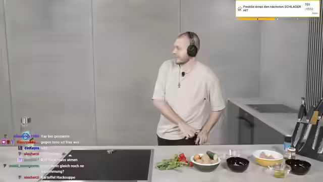 04:28:01Die Vorbereitungen für das Gericht beginnen mit dem Schälen und Waschen der Kartoffeln, was als einfacher und risikofreier Startpunkt des Kochduells betrachtet wird. Gleichzeitig tauchen technische Probleme auf. Es gibt Verwirrung bezüglich der Mikrofone, da Nina sehr leise ist, und es gibt unklare Regelungen zur Nutzung der Küchengeräte, was zu Unsicherheit führt. Streamer entscheidet sich, das Gericht ohne Monsieur Cuisine oder andere Hilfsmaschinen zuzubereiten, um fair zu bleiben.
