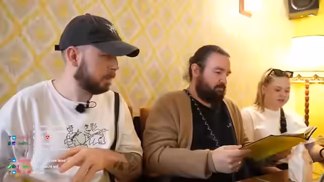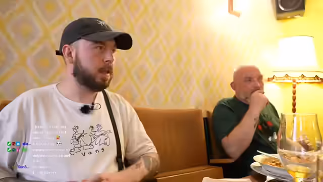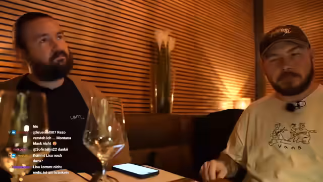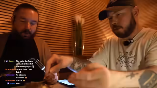 06:01:48Bei der Essenswahl überlegen die beiden zwischen knusprigen Kalamaris, Rinderrippchen und einem Flanksteak. Sie entscheiden sich, die Rippchen zu teilen, da sie eine große Portion als zu viel erachten. Der Streamer unterhält sich mit dem Chat über Popkultur-Referenzen und aktuelle Stream-Themen wie Papa Platte. Schließlich streamt er auf seinem zweiten Gerät eine Reaktion auf Papa Plattes Stream und interagiert mit dessen Chat.