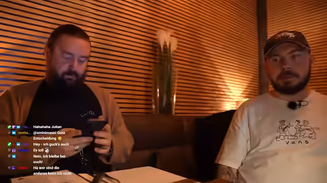 06:05:31Nach einer kurzen Abwesenheit kehrt der Streamer zurück zum Chat und begrüßt die verbliebenen Zuschauer. Im weiteren Verlauf des Streams entsteht eine Diskussion über den Konkurrenz-Stream von Rezo. Der Streamer wechselt auf dessen Livestream, bemerkt aber, dass seine eigene Nachricht nicht vorgelesen wird und fühlt sich dadurch übergangen. Dies führt zu einem ironischen Kommentar über seine seit sieben Minuten andauernde Fan-Treue.