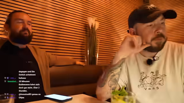 06:15:43Gemeinsam werden verschiedene Longdrinks probiert und bewertet, darunter ein Rhabarber-Drink und ein Frangelico-Sour. Der Streamer äußert seine Vorliebe für gut gemixte Cocktails und entwickelt eine persönliche Ästhetik: Tattoo-Barkeeper gelten als cool, während Cocktails mixende Personen mit Billig-Burberry-Hut als unangenehm cringe empfunden werden. Dies wird auf die allgemeine Diskussion über Ästhetik und persönliche Vorlieben ausgeweitet.