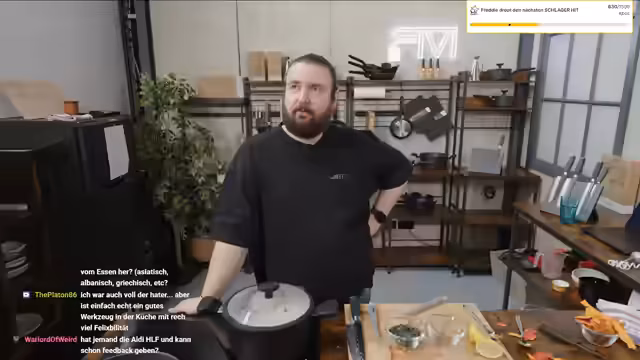00:32:10Der Streamer beginnt mit der Zubereitung einer Kürbissuppe mit Kürbiskernkrokant. Er erklärt, dass der Hokkaido-Kürbi essbar ist, sich aber beim Verzehr besser anfühlt, wenn er geschält wird. Während des Kochprozesses unterhält er sich mit dem Chat über verschiedene Küchen und Speisen, bevor er den Krokant mit Zucker, Gewürzen und Kürbiskernen zubereitet. Die Suppe wird im Anschluss püriert serviert.