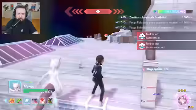 04:36:17Der Streamer navigiert durch eine neue Dimensionsverzerrung in einem Spiel, bei der er sich in einem Parkour-ähnlichen Bereich, speziell auf einem Dach, zurechtfinden muss. Die Suche nach dem Weg nach oben gestaltet sich als frustrierend und zeitintensiv. Er verliert den Überblick über die vorgegebenen Quests und muss sich neu orientieren. Nach mehrmaligem Versagen gelingt es ihm schliesslich, den höheren Bereich zu erreichen, um die Forschung abzuschliessen und das Ziel Pokémon für den Pokédex zu finden.
