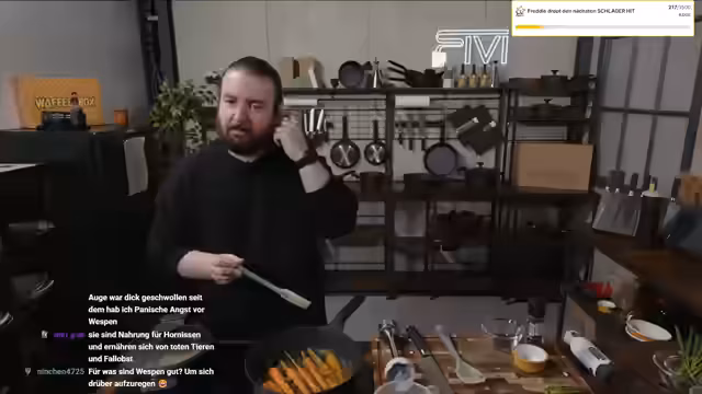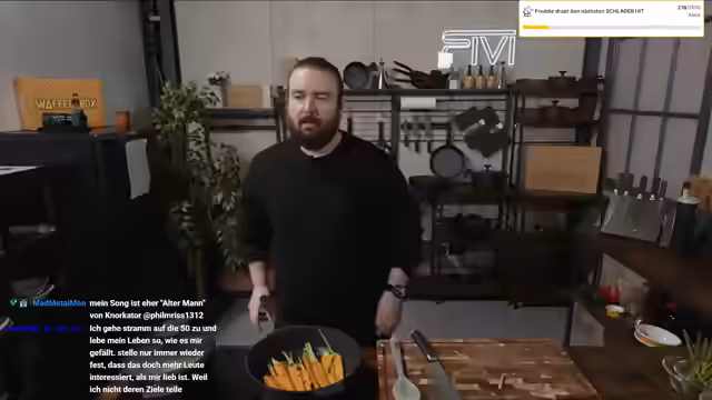 00:14:52Der Streamer beginnt mit der Zubereitung des heutigen Gerichts: Möhren mit Bulgur. Er nimmt 175 Milliliter warmes Wasser und einige Rosinen, die er einweicht lässt. Er beschreibt das Rezept mit dem Gewürz Ras el Hanout und freut sich auf das Ergebnis. Die Zuschauer werden in den Kochprozess eingebunden und können Fragen stellen.