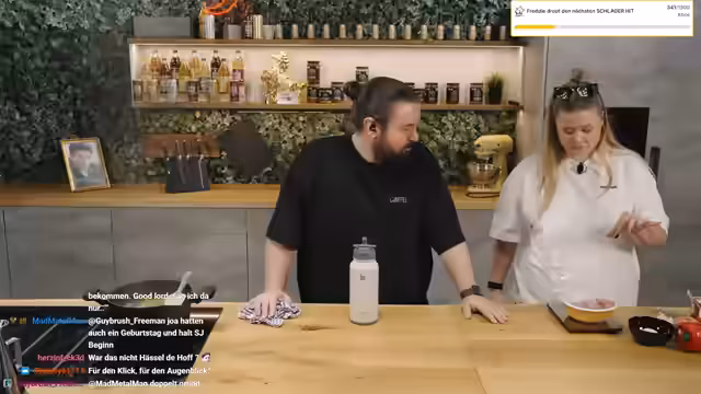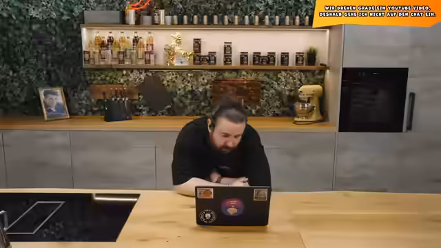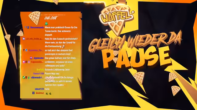 01:40:36Während das Hackfleisch für die Burger Patties vorbereitet wird, gibt es eine humoristische Suche nach Gurkenschnitzel in einem Glas, die im Raum steht. Als Sturmwaffel dann die Patties formt, verspürt er einen plötzlichen, starken Schmerz im Rücken und kann sich kaum mehr bewegen. Er versucht, die Verletzung selbst zu dehnen, was zu witzischen Reaktionen im Chat führt.