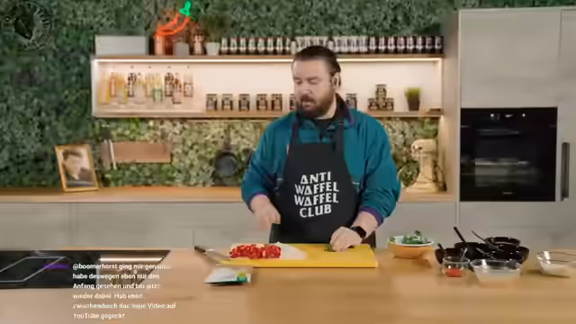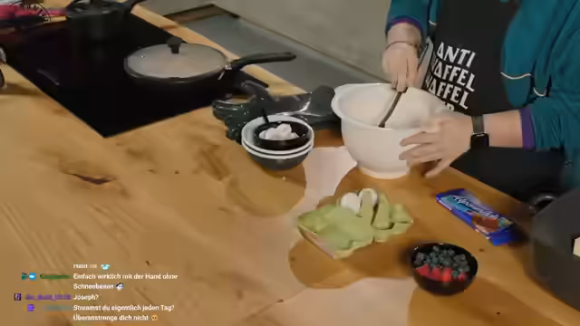 05:55:51Zu Beginn des Streams wird ein klassischer Mitkoch-Stream angekündigt. Der Streamer gibt eine wichtige Anweisung an den Chat: Für ein authentisches Kocherlebnis soll dieser laut „Mhh“ schmecken, wenn der Geruch gut ist. Nach einer Zählung beginnen die Vorbereitungen für ein Abendessen, insbesondere für einen ungewöhnlichen Backofen-Pfannekuchen. Das Rezept für den Nachtisch wird vorgestellt: Vier Eier, Mehl, Milch, etwas Butter, Puderzucker und geschmolzene Schokolade werden für einen luftigen Pfannekuchen benötigt. Während der Vorbereitung wird ein vergessener Reiskocher aus dem Jahr 2017 erwähnt und eine Anekdoten über einen Treffen auf einer Aftershow-Party mit Matthias Schweighöfer und Wilson Ochsenknecht geteilt.