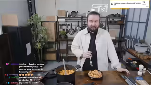 00:52:36Während des Kochprozesses wird auf die neue Webseite fiwi.gg hingewiesen und auf die neuen Microplane-Produkte, die im Shop verfügbar sind. Gleichzeitig startet eine Community-Aktion im Twitch-Chat. Bei Erreichen des Level 10 eines Hype Trains verspricht der Streamer einen 10% Rabatt auf den Relaunch der Webseite. Die Zuschauer zeigen sich sehr sozial und spenden viele Subs für andere, was eine positive Atmosphäre schafft.