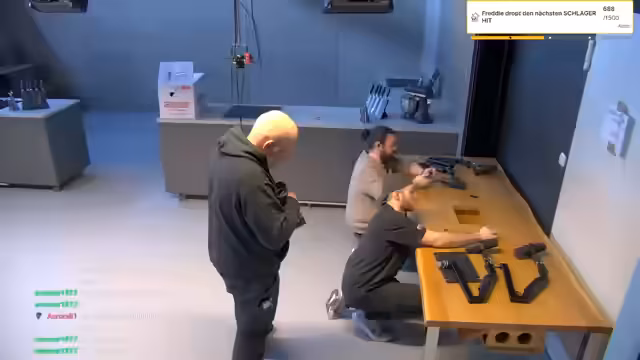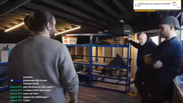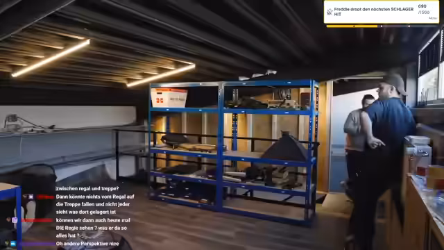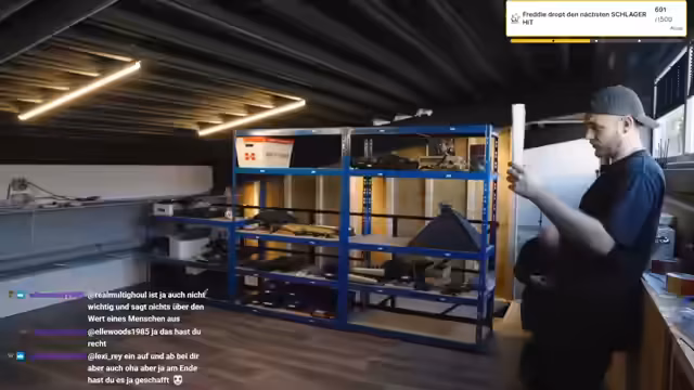 00:24:53Der Streamer kündigt eine Kooperation mit fibi.gg für 14 Uhr an, bei der sie gemeinsam ein Projekt anschauen werden. Hauptfokus des Streams liegt auf dem Umbau des Techniklagers und des Greenrooms, einschließlich Bodenverlegung und Neuaufbau des Kostümbereichs. Die Zuschauer werden über anstehende Veränderungen informiert und dazu eingeladen, den Umbau-Prozess zu begleiten. Nils arbeitet an einer Empore, die für das Kostüm genutzt werden soll.