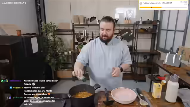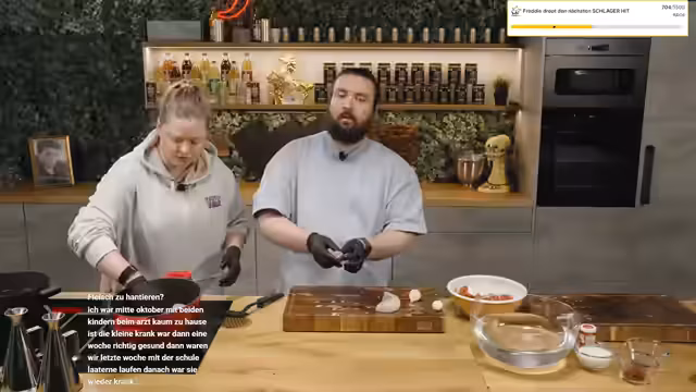 02:57:02Das vierte Rezept des Tages ist 'Macaroni Frikandelli', ein TikTok-Trendrezept mit über einer halben Million Klicks. Die Zubereitung beginnt mit dem Kochen der Makkaroni, für die eine Kochzeit von sieben Minuten ermittelt wird. Parallel dazu werden Frikandel in kleine Stücke geschnitten, um sie später in das Gericht zu integrieren und zu dekorieren. Während der Zubereitung kommt es zu humorvollen Diskussionen und Neckereien über die Herkunft des Rezepts und die ungewöhnliche Kombination der Zutaten. Die Streamerin wird scherzhaft als 'Frikantel-Schmuggler' bezeichnet, da sie das Rezept ausgewählt hat. Es wird auch über die Ernsthaftigkeit von Meinungsverschiedenheiten im Stream gesprochen, wobei betont wird, dass die Fetzereien immer nur Spaß sind und nicht ernst gemeint. Die Interaktion mit den Zuschauern zeigt, dass diese die humorvollen Auseinandersetzungen als Teil des Unterhaltungswerts des Streams schätzen.