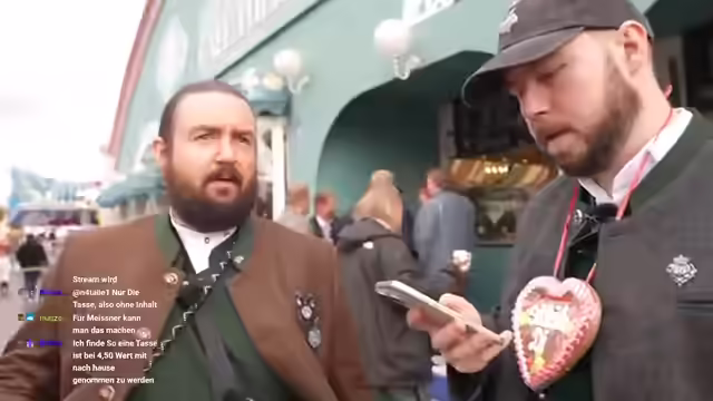 05:47:55Ein "Schleichdieb"-Herz wird für jemanden ausgesucht, und die Gruppe setzt ihren Weg fort, vorbei an einer Entenbraterei und der geheimen Bar. Es wird überlegt, Fahrgeschäfte auszuprobieren, aber der Fokus liegt weiterhin auf dem Videodreh. Die alte Wiesn mit ihren traditionellen Hütten wird als potenzielles Ziel erwähnt. Die Gruppe diskutiert verschiedene Essensoptionen, darunter Ochsenfetzen im Semmel, und erinnert sich an frühere kulinarische Enttäuschungen. Die Gruppe einigt sich darauf, einen Ochsenfetzen-Semmel zu holen. Es wird über die Bezeichnung "Arschfetzen" für ein Spiel diskutiert. Ein Strudel wird entdeckt und die Gruppe schlendert weiter, wobei sie überlegt, wo sie als nächstes einkehren soll.