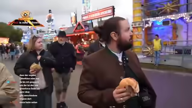 07:23:08Die Gruppe hält kurz an und entscheidet sich für Spätzle. Es wird transparent gemacht, dass ein Zuschauer einen Teil der Kosten übernommen hat. Die Spätzle werden als deftig mit Paprika und Speck beschrieben, frisch mit Käse und Sahne zubereitet. Der Geschmack wird gelobt, besonders die Paprika. Es wird jedoch angemerkt, dass frische Paprika Röstaromen vertragen könnte. Die Spätzle erhalten eine hohe Bewertung. Anschließend macht sich die Gruppe auf den Weg zum veganen Leberkäse für Nina. Es wird überlegt, ob es Mülleimer auf dem Oktoberfest gibt und ob diese aufgrund von Attentatsrisiken abgeschafft wurden. Die Gruppe erreicht den Stand mit dem veganen Leberkäse und bestellt. Nina probiert den Leberkäse mit Gurke und Senf und gibt ein Urteil ab. Der Leberkäse hat wenig Eigengeschmack und wird als etwas fad empfunden. Es wird ein Vergleich zum Leberkäse von Green Force gezogen. Der vegane Leberkäse erhält eine mittlere Bewertung. Abschließend wird das Ende des Videos angekündigt und die Gruppe macht sich auf den Weg zum Ausgang. Es wird überlegt, ob noch ein Schokoobst geholt werden soll. Die Gruppe bedankt sich bei den Zuschauern und beendet den Stream.
