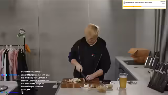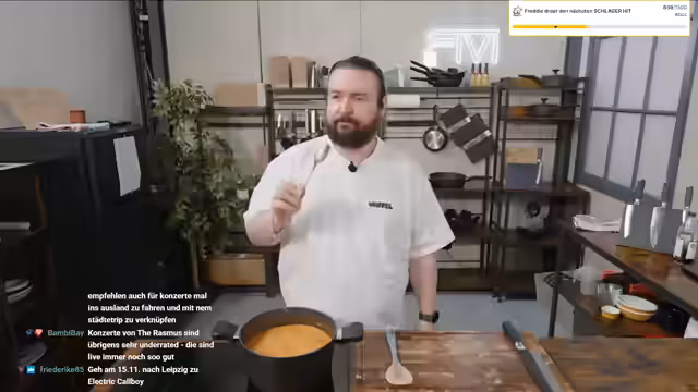 00:02:29Der Stream beginnt mit ungewöhnlichem Hintergrundgeräusch, das von Arbeiten an der Einfahrt stammt. Der Streamer begrüßt seine Zuschauer und kündigt einen Quick-Mittag an. Er ist heute sehr aufgeregt und plant, einen Linsenkürbiseintopf mit Tofu zuzubereiten. Im Chat wird ein Kollege kontaktiert, um ein verfügbares Rezept zu klären. Während des Schneidens der Zutaten teilt der Streamer mit, dass er sich für mögliche VIP-Plätze im Borussia-Mönchengladbach-Stadion ein Angebot hat erstellen lassen und ist daher aufgeregt.