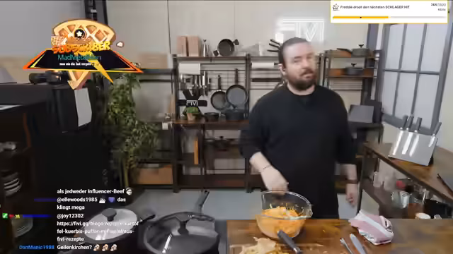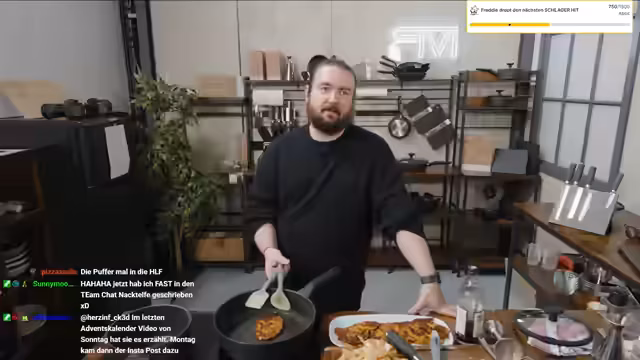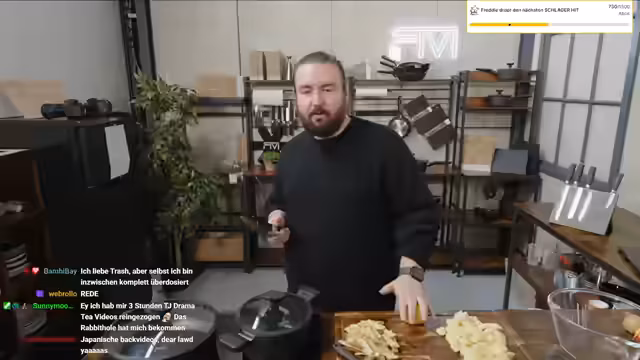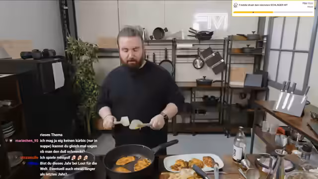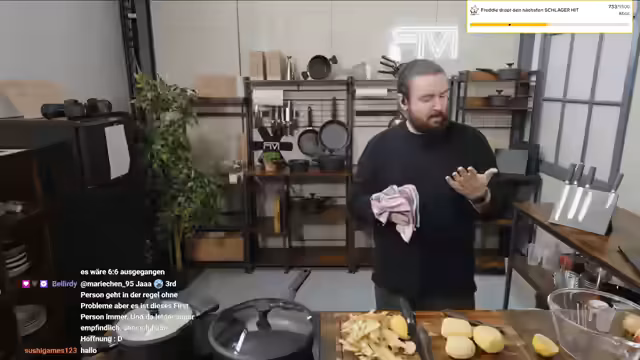 00:08:21Sturmwaffel startet den Stream mit dem Hinweis, dass er einen Quick-Mittag ausprobiert, da er nach dem Urlaub noch gesundheitlich angeschlagen ist. Er plant für die nächsten vier Tage inklusive Wochenende intensivere Streaming-Sessions. Während des Streams bereitet er Kartoffel-Kürbis-Puffer mit selbstgemachtem Apfelmus zu, indem er Äpfel schält, entkernt und würfelt. Das Rezept steht online zur Verfügung.