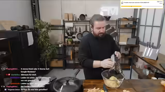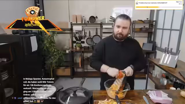 00:36:58Während des Streams werden die Kartoffeln und der Hokkaido-Kürbis geraspelt und mit Ei vermischt. Für das Apfelmus werden Äpfel mit Zitrone und etwas Wasser eingekocht. Sturmwaffel gibt Tipps zur Heißluftfritteuse, die weniger Strom und Fett verbraucht, aber für große Mengen wie Kuchen ungeeignet ist. Er erwähnt auch ein Rezept für selbstgemachte Bratlinge aus einem Video.