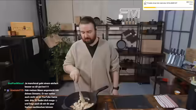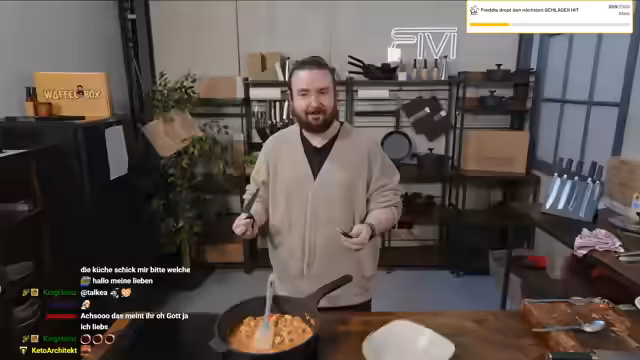 00:55:18Während das Paprikasahnehähnchen köchelt, unterhält sich der Streamer mit der Community über verschiedene Themen. Er äußert sich zur Zuschauerstruktur seines Kanals, die hauptsächlich aus Berlin, Hamburg und München stammt. Es werden persönliche Themen wie sein Alter und Aussehen angesprochen, wobei er betont, dass er es mag, älter auszusehen. Zudem erwähnt er seinen Freundeskreis, darunter Julian Bam, und erzählt eine Anekdote über eine Pizzaschere.