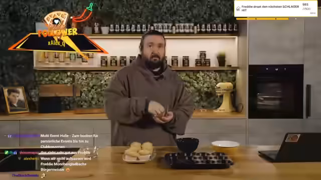 06:27:00Sturmwaffel erklärt, dass der Dragon Monday ausfällt und stattdessen gebacken wird. Es wird Zitroniges in Muffinform geben, und er freut sich darauf, Zitronenmuffins zu machen. Er sucht online nach einem Rezept und lobt die fivi.gg-Webseite für ihre werbefreie Rezeptdarstellung. Er liest das Rezept durch, plant die Umluft auf 160 Grad vorzuheizen und stellt fest, dass er drei Esslöffel Zitronensaft für die Deko benötigt. Er erinnert sich an frühere Backkrisen und stellt sicher, dass er vorbereitet ist. Er scherzt über den Namen 'Schubi die Katz' und beginnt, die Zutaten vorzubereiten. Er plant, einen Knethaken für den Teig zu verwenden und beantwortet Zuschauerfragen zum Thema Gaming, wobei er erklärt, dass er lieber privat spielt und keine Zeit für den kompetitiven Grind hat.