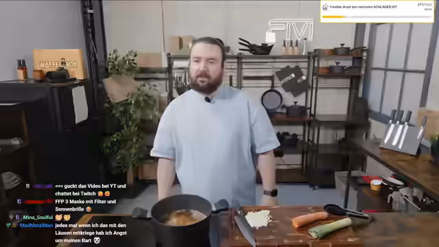 00:05:21Der Stream beginnt mit einer herzlichen Begrüßung der Zuschauer. Es wird über das kalte Wetter gesprochen, wobei der Streamer einräumt, bei der Wahl seiner Kleidung für den Tag Fehler gemacht zu haben. Er begrüßt die Zuschauer beim sogenannten Kühlmittag, einer schnellen und unkomplizierten Kochsession, die er als Teil seines regulären Montagsablaufs etabliert hat.