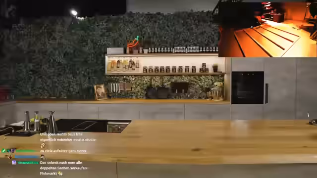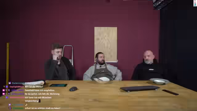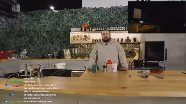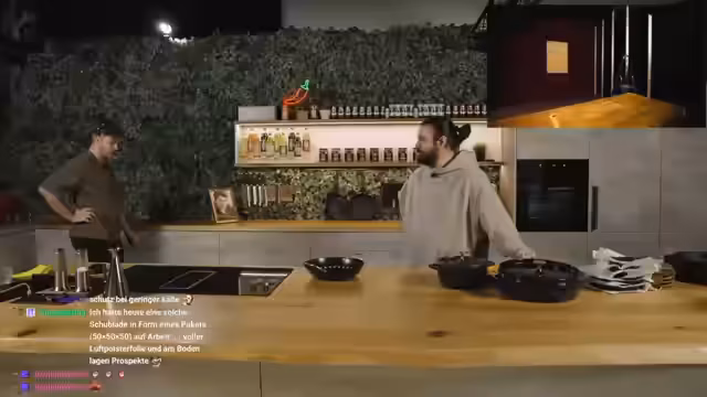 02:11:24Timo richtet coole Szenen ein, während Freddy das Objektiv rauszoomt, um mehr von der Viererküche zu zeigen. Es wird besprochen, die Ecke greifbar zu machen, um alles schnell shooten zu können. Nils bastelt, während Timo sich die Sachen für Donnerstag in der Viererküche ansieht. Nils schneidet Holz zu, und es wird die Konstruktion der Wände erklärt: Unterkonstruktion, Holzlage für Schrauben, OSB-Platten und Gips. Sturmwaffel flitzt nach vorne, um sich das Bild anzusehen und gegebenenfalls das Mikro wieder anzuschalten, falls etwas Dramatisches passiert. Timo bringt Nils ein Headset mit, damit sie sich in verschiedenen Räumen hören können. Sturmwaffel klaut den Chat und überlegt, Nudeln zu essen. Er macht eine Liste für die Viererküche und bestellt viermal ein Zwölfer-Set und ein Fünfer-Messerset. Es werden außerdem vier große Schneidebretter benötigt. Er fragt nach Töpfen, Pfannen und Küchenhelfern und erwähnt das Problem, Grillroste und Bleche zu finden. Ofenhandschuhe und Strom werden ebenfalls benötigt. Es wird überlegt, ob die Messer für den Donnerstag-Stream geschliffen werden sollen.